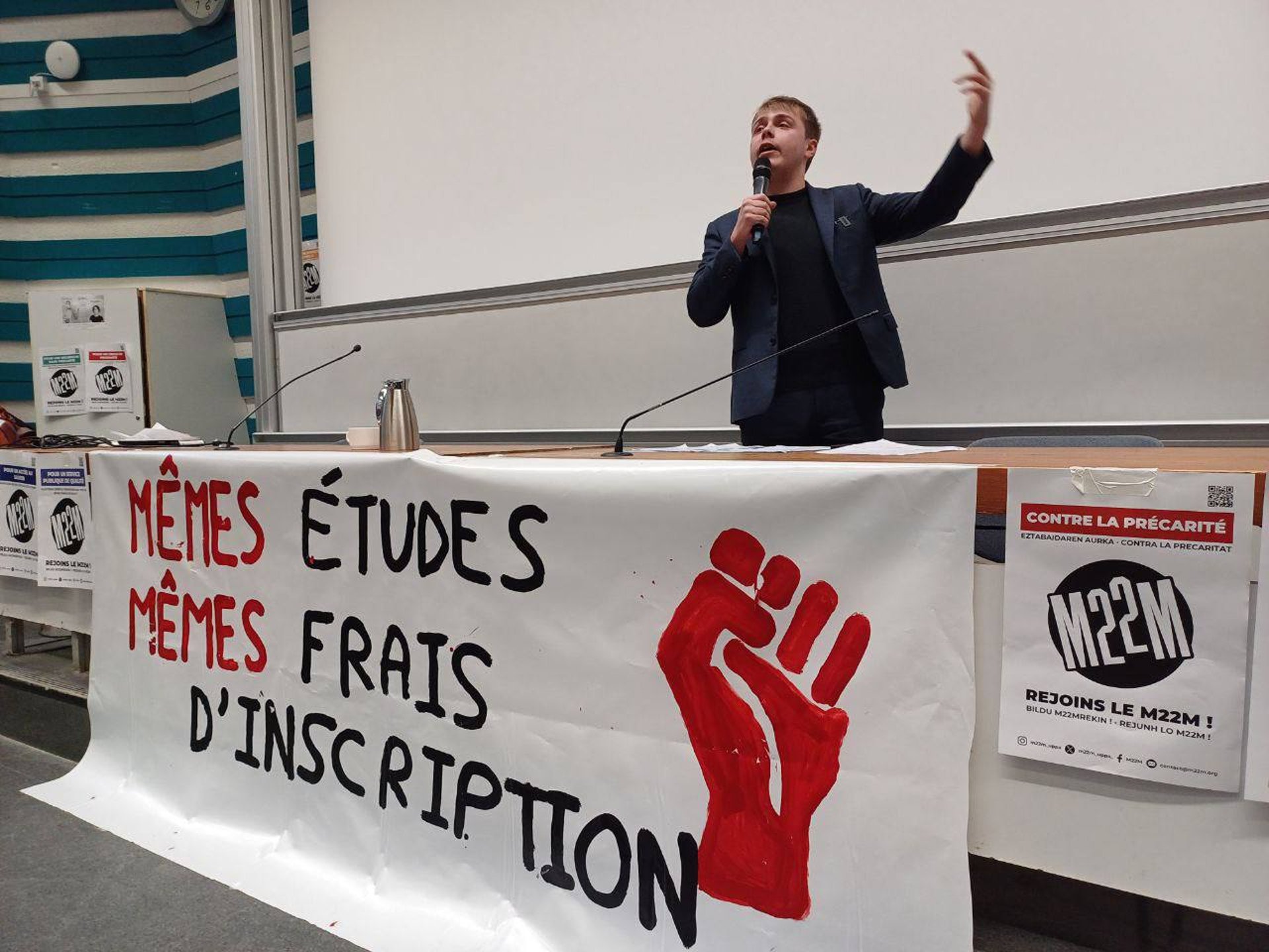 " Plus de 500 étudiants à Pau pour la reprise de notre tournée des facs ! Contre la réforme « Bienvenue en France » qui fait payer les étudiants étrangers 3 à 4000€ pour s’inscrire à la fac. Aujourd’hui, ce sont les étrangers. Demain, ce seront tous les étudiants. Merci Pau ! "